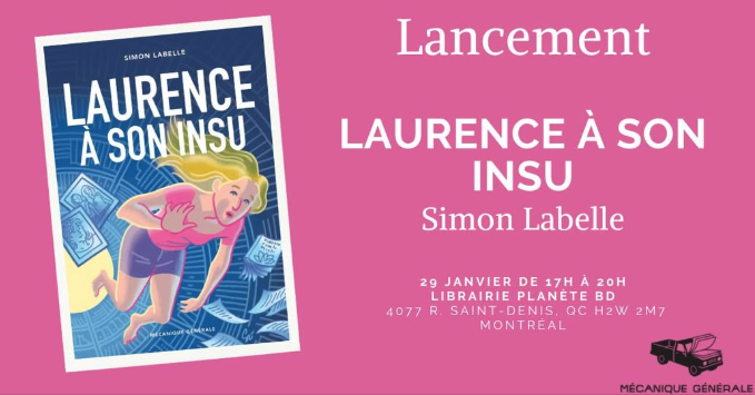 Jan 29 17:00 - 20:00 Lancement – Laurence à son insu Planète BD 4077 R. Saint-Denis, Montréal Détails des Évènement Recevoir l’Itinéraire à suivre